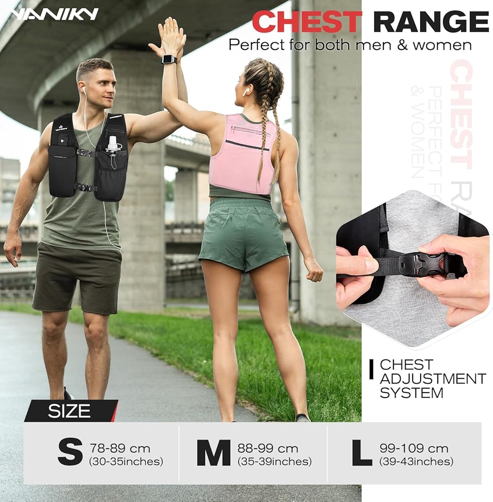 Anti-Slip Adjustable Chest Straps: The YANIKY Unisex Running Vest features 2 wide adjustable chest straps with anti-slip buckles that stay securely in place, so you won't need to adjust them mid-run. Designed to deliver a custom, secure fit, it minimizes bounce and keeps you comfortable. Built to prevent chafing and fit most body types, it offers an adjustable range of 30 to 43 inches for a personalized experience.