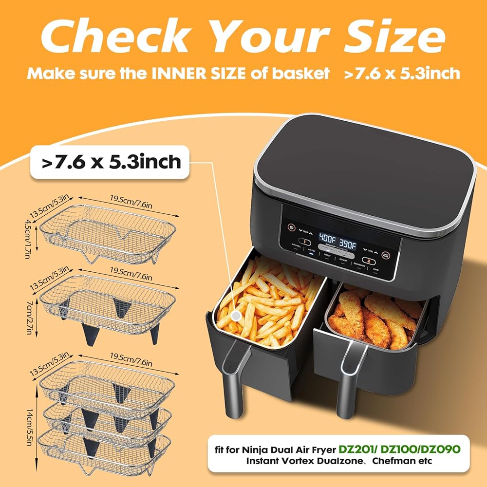 Make sure the INNER SIZE of basket >7.6 x 5.3inch. ( Stainless Steel Air Fryer Rack Tray fit for most Rectangle Air Fryer, Pressure Cooker, Oven, such as fit for Ninja Dual Air Fryer DZ201/ DZ100/DZ090 , Instant Vortex Dualzone、Chefman etc)