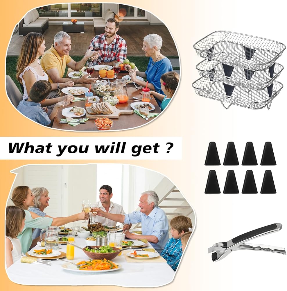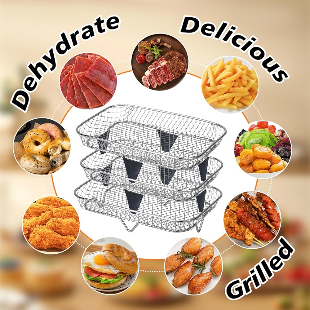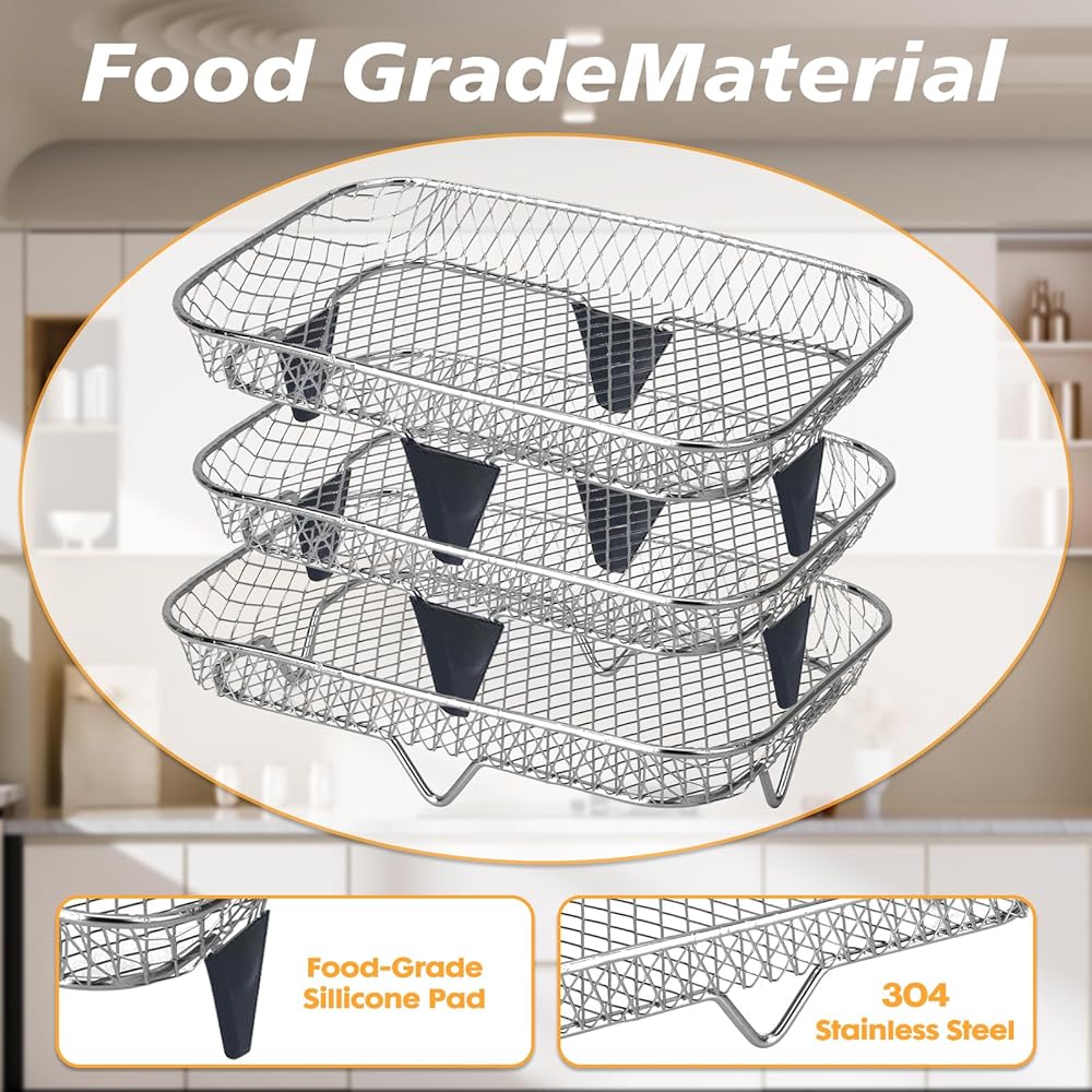 【Save your time & More food at one time】3 layers stackable airfryer basket stand, at the same time newly upgraded taller legs increase the height at which food can be placed, while ensuring that each level receives plenty of grilling; Quickly cook delicious food for whole family