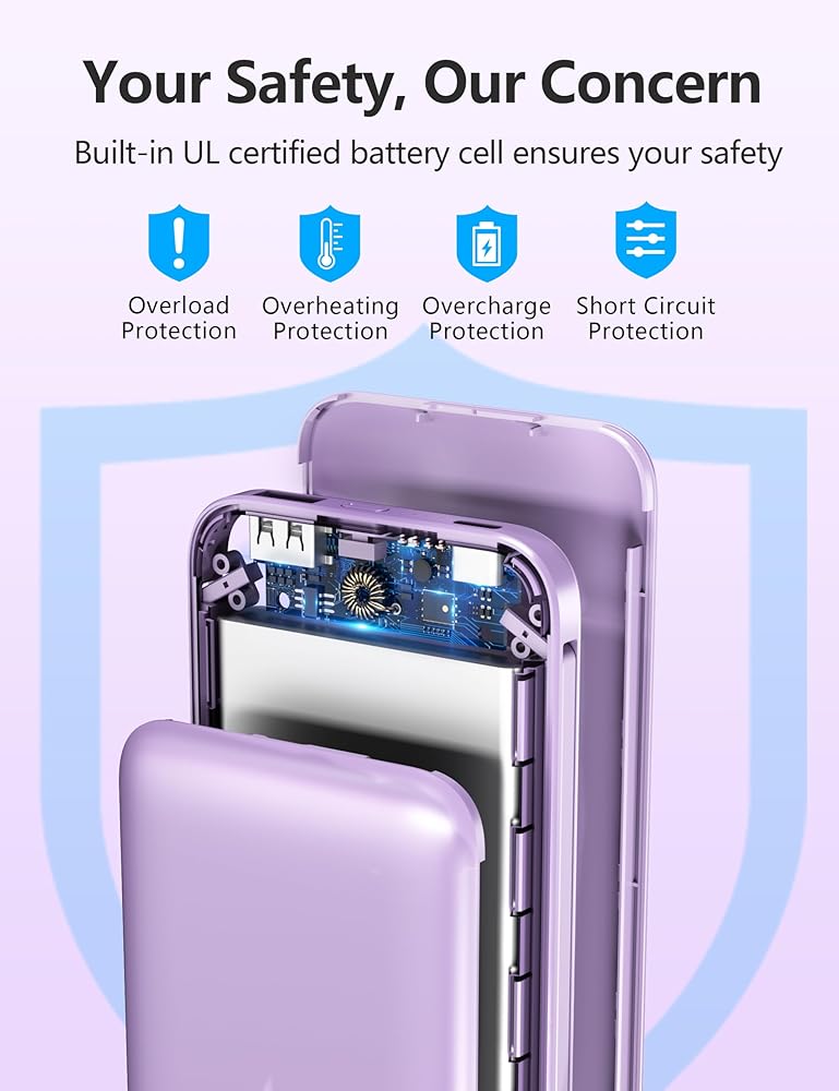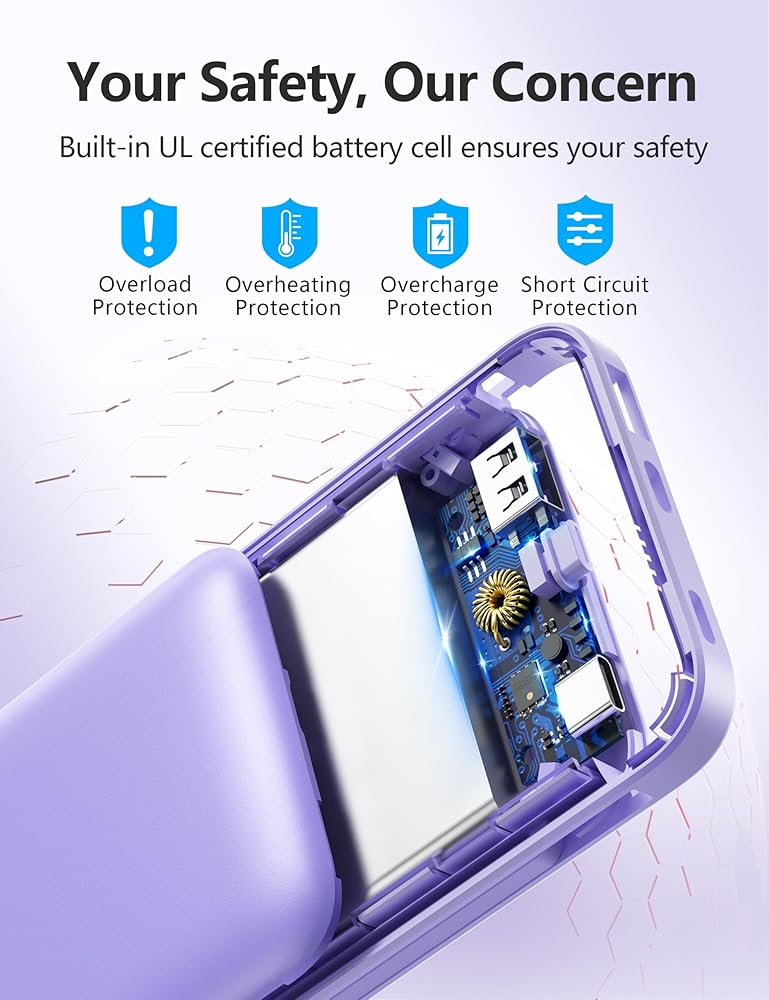 【UL Certified Safety & Wide Compatibility 】 Metecsmart portabale charger built in UL certified battery cell ensures your safety and prevents overcharging.This charger supports pass-through charging, allowing you to use your device while it's plugged in and recharging. Most important is that the ultra-high density Metecsmart power bank battery safer than the normal Li-polymer cell, which makes it's so ultra-slim and safe as well, this portable battery charger is fully compatible with iOS smartphones and all USB-C devices
