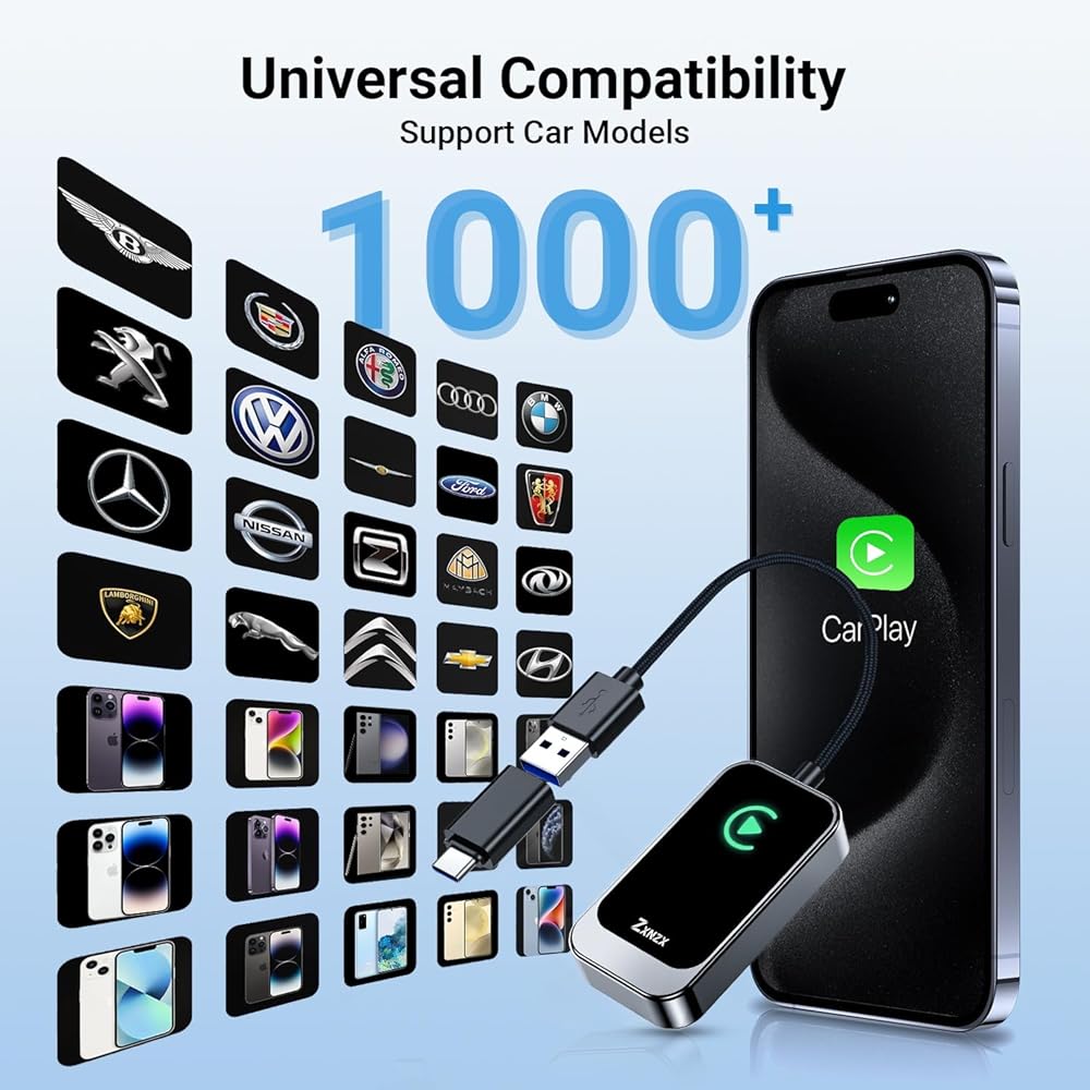 Wide compatibility: This car wireless adapter is designed specifically for vehicles equipped with Apple car wireless adapters and is compatible with over 1000 vehicle models. Supports iPhone 6 and above (iOS 10+) and Android 10+ phones. Before purchasing, please ensure that your iPhone is an iPhone 6 or higher model, your Android is an Android 10+ or above model, and the operating system is iOS 10, Android 10+or higher. (Mobile phone with Carplay function).