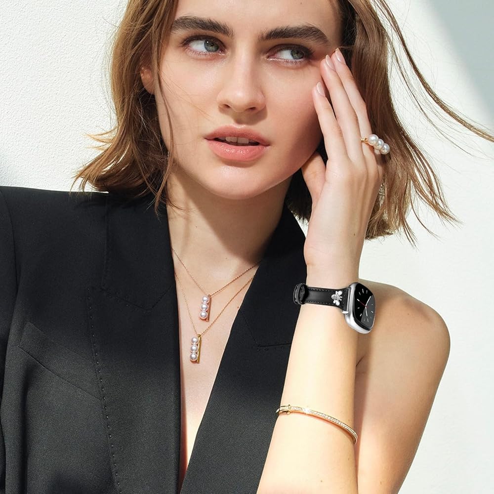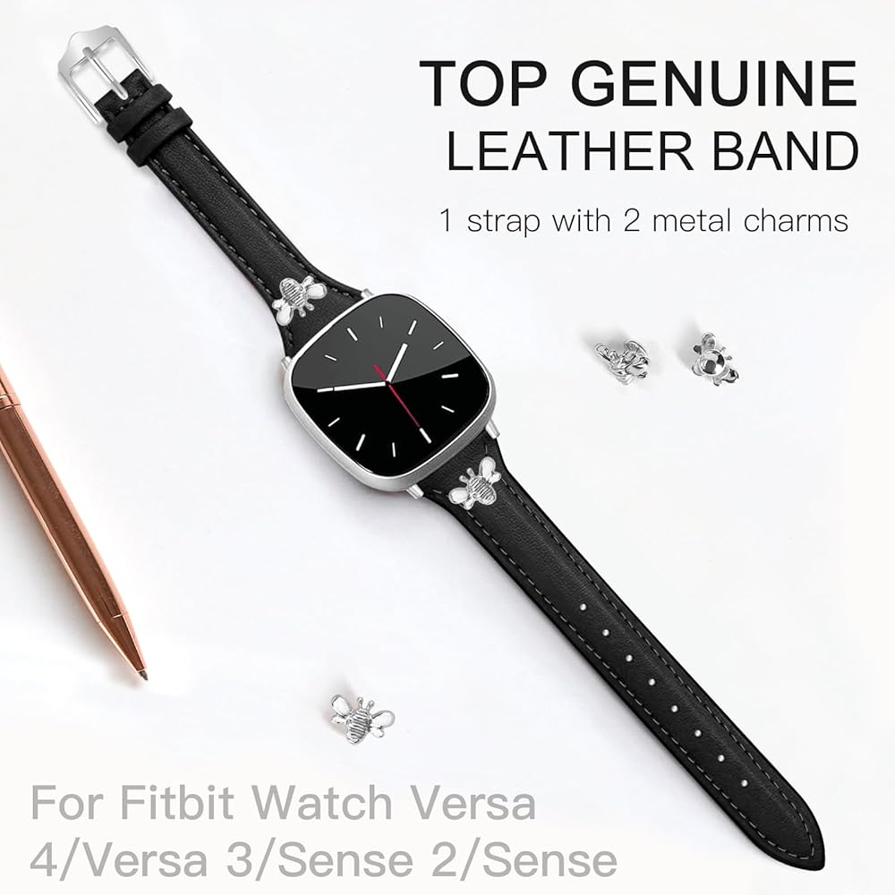 JR.DM Slim Leather Bands Compatible with Fitbit Versa 4/Versa 3/Sense 2/Sense Band, Top Genuine Soft Leather Band with Charms, Feminine Designer Strap for Fitbit Smartwatch