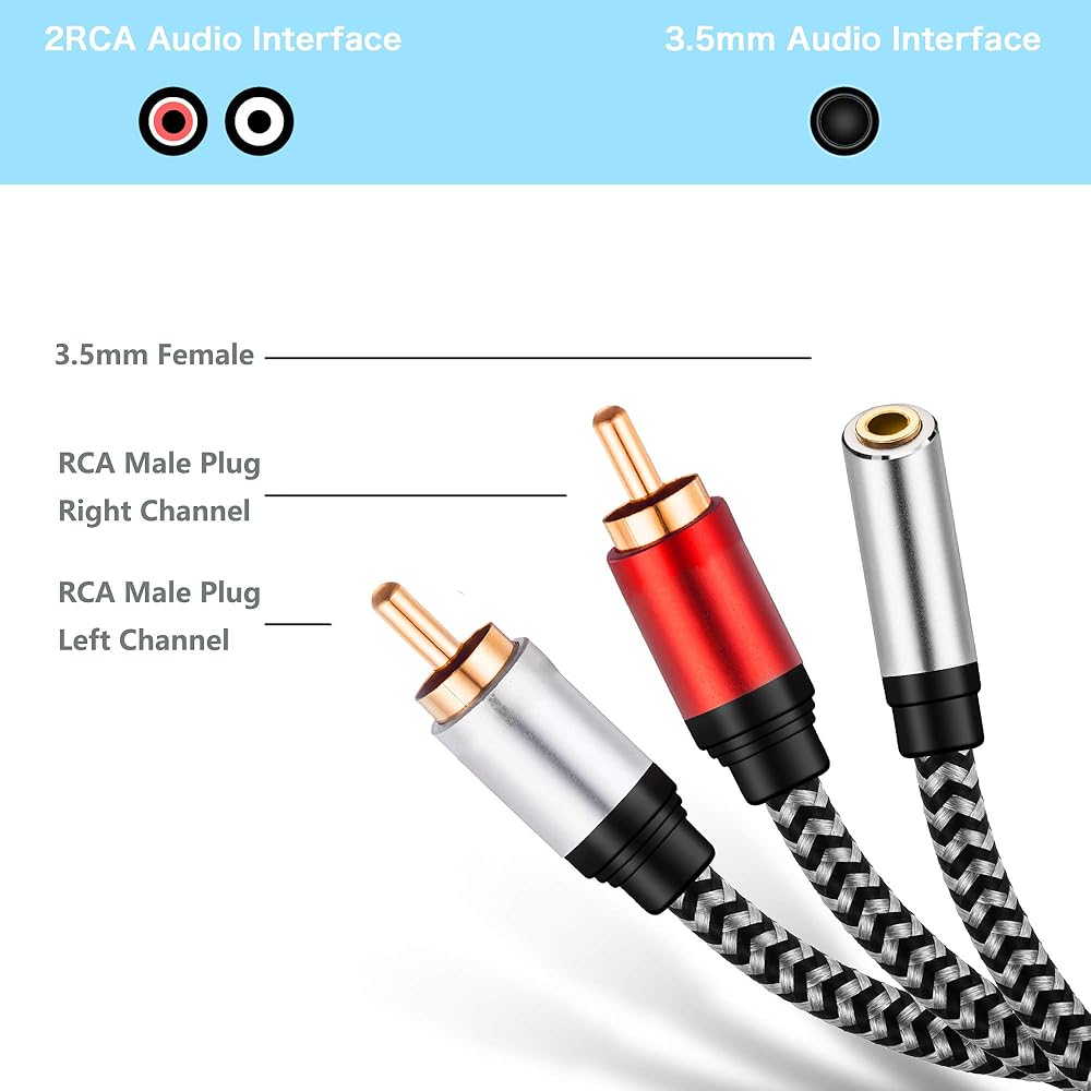 🎧3.5mm Female to 2RCA Male Adapter: This 3.5mm Female to dual RCA Male Cable is ideal for adapting the output of your PC, or personal audio to stereo RCA jacks for a quick transition from headphone to rca connection.Simply plug the 3.5mm end to the headphone jack on your audio device and the 2RCA ends to the sound system. The 1/8 to red and white adapter would offer a remarkable stereo sound experience to you