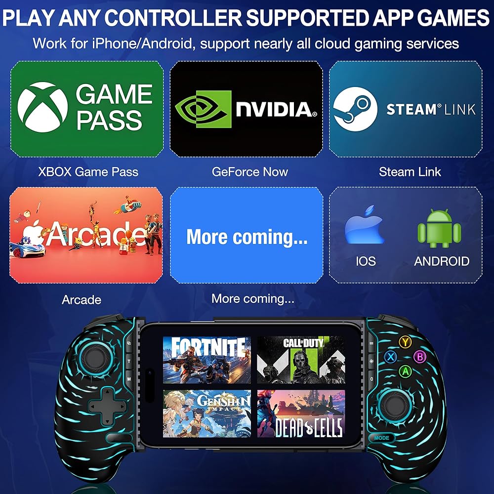 【PLAY ANY MOBILE CONTROLLER SUPPORTED APP GAMES】 The controller for iphone is designed to enjoy unstoppable gaming experience, work for iPhone/Android, support nearly all cloud gaming services including Xbox Cloud、Steam Link、GeForce Now、MFi Apple Arcade & hundreds of popular mobile games like Call of Duty, Roblox, Minecraft, Fortnite etc. The phone game controller perfects your mobile gaming experience beyond a console by making it happen anywhere, anytime, to anyone