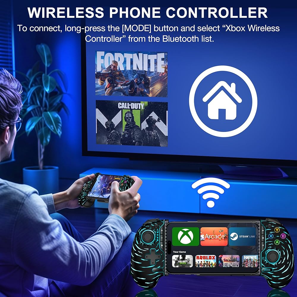 【PHONE CONTROLLER CONNECTION GUIDE】 The iphone controller is connected wirelessly via Bluetooth. Long press the "MODE" button for 3 seconds to connect, and a blue light will flash rapidly. Turn on your phone's Bluetooth and find the Bluetooth name “Xbox Wireless Controller”, click on pairing to connect. After the first connection, press the MODE button on the controller with Bluetooth enabled on the phone. The “MODE” button light will flash slowly and blue to reconnect