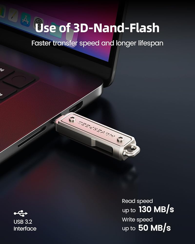 USB 3.2 Port Fast Transfer: USB thumb drive with a read speed up to 130 MB/s and write speed of 50 MB/s, this usb memory stick is much faster than standard USB 2.0, saving you time. Plug and play, no software needed.