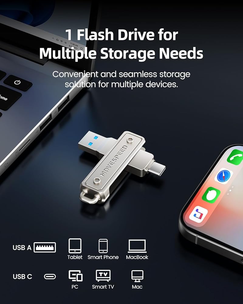 Dual-Port Drive for Multiple Devices: USB 3.2 thumb drive features USB-C and USB-A ports, making data transfer between smartphones, tablets, and computers effortless. One usb c drive for all your needs.(Single pack)