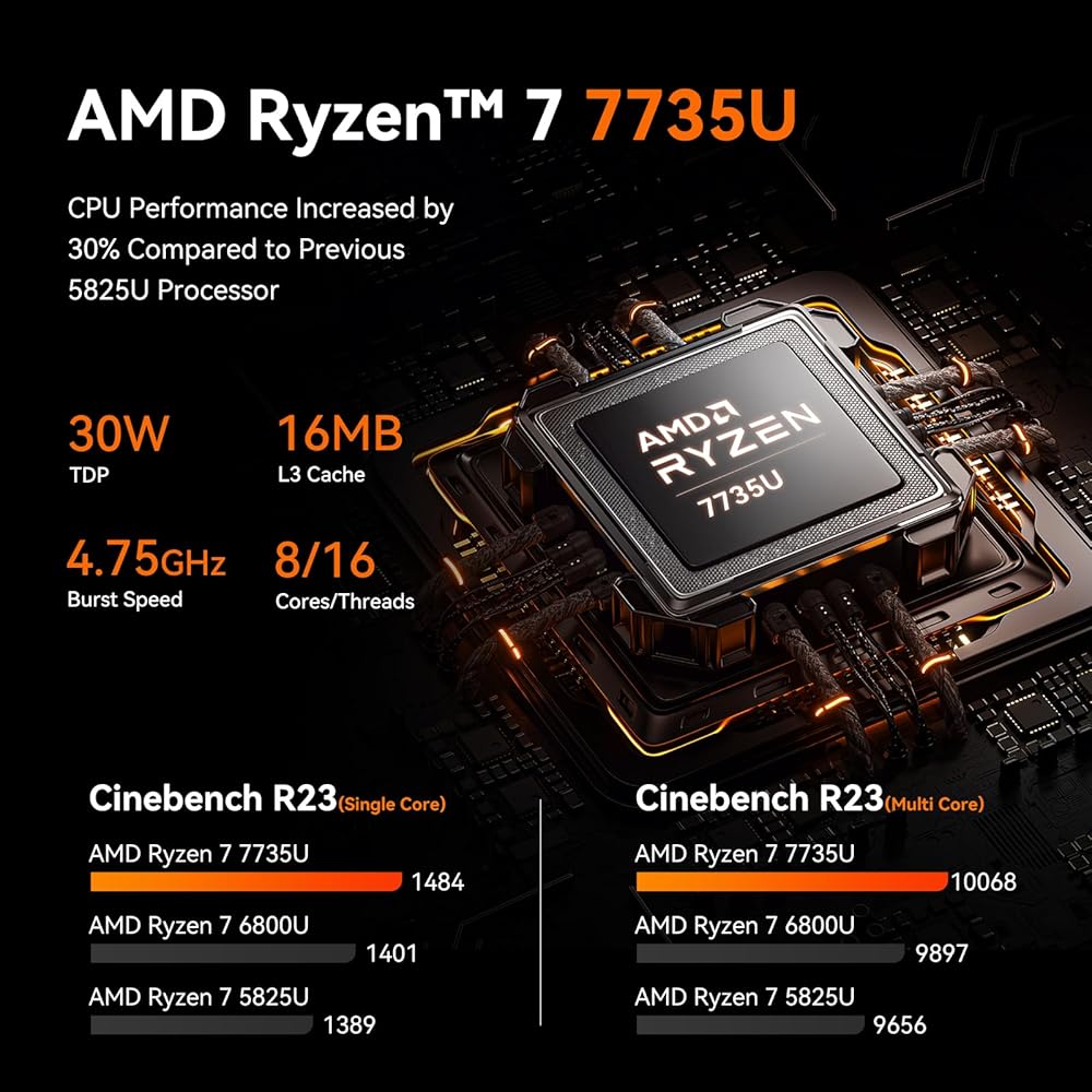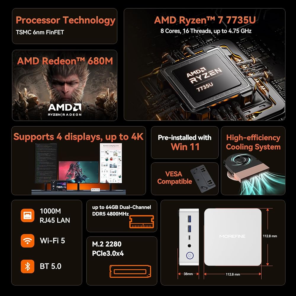MOREFINE M700 Mini PC, Ryzen 7 7735U (8C/16T, up to 4.75Ghz), Mini Desktop Computer 16GB DDR5 512GB M.2 NVMe SSD, Small PC Desktop Support 4k Dual Display WiFi6/BT5.2/USB3.2