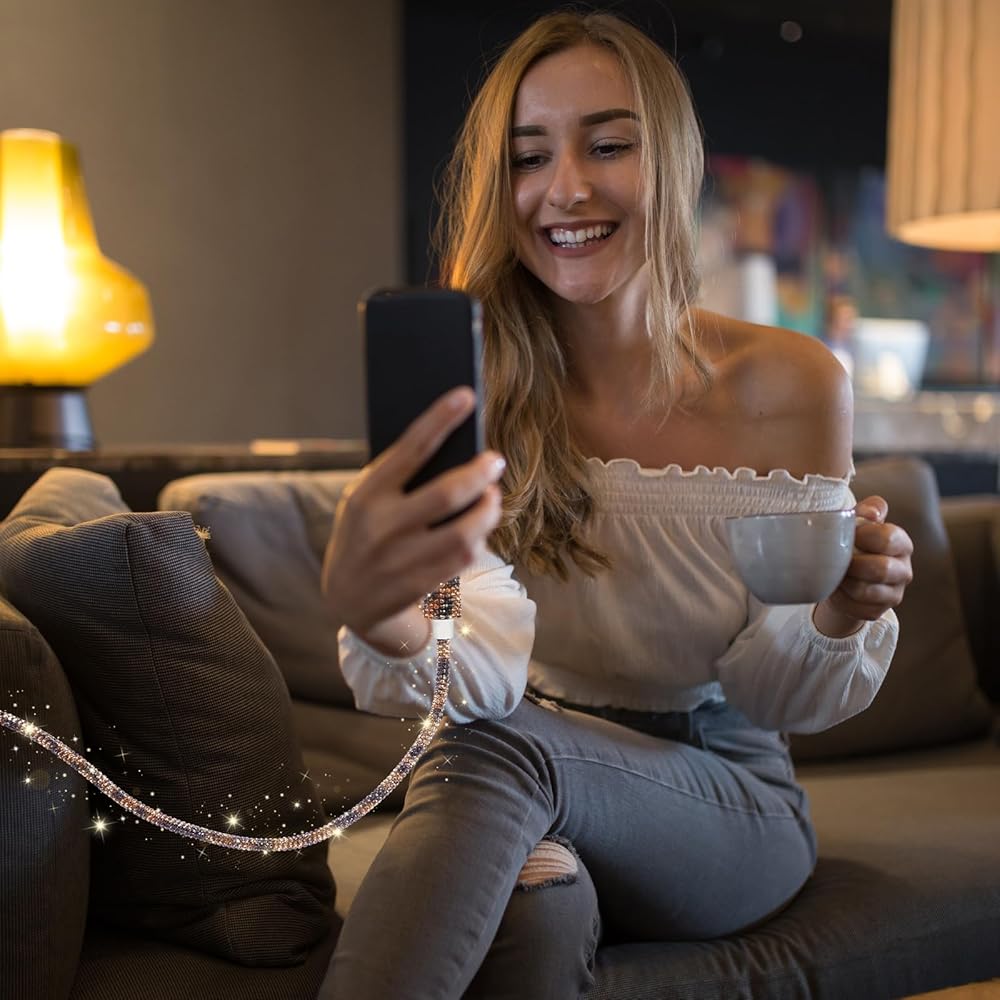 Delicate and Sparkly: Over 800pcs AA SS16 white Rhinestone crystal were glued on usb c charger cable.All stones are made of glass after several times of grinding and polishing.There are 16 cuts which can be refracted rainbow color under light.