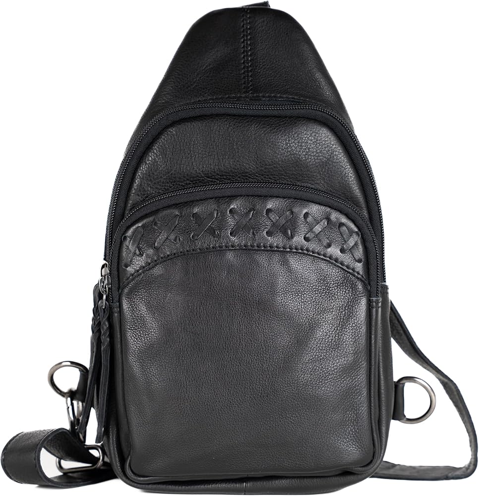 Lady Conceal Taylor Leather Unisex Tactical Gun Holster Sling Backpack - Medium Frame Handgun -Two concealment pockets with Locking Zippers and Universal Holster (Black) - 7" L x 12" H x 3.5 D