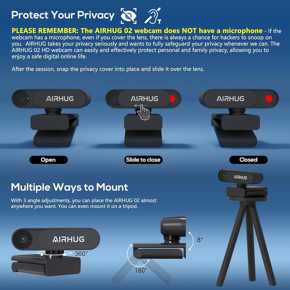 • KINDLY REMINDER: The AIRHUG 02 webcam does NOT have a microphone - If the webcam has a microphone, even if you cover the lens, there is always a chance for hackers to snoop on you. AIRHUG takes your privacy seriously and wants to fully safeguard your privacy whenever we can. The AIRHUG 02 HD webcam can easily and effectively protect personal and family privacy, allowing you to enjoy a safe digital online life.