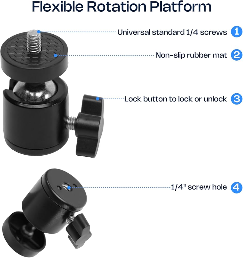 • The Mini Tripod with 1 pack mini ball head, 360 ° horizontal rotation, 90° vertical rotation; the ball head can be fixed easily by locking knob for meeting different shooting angles.
