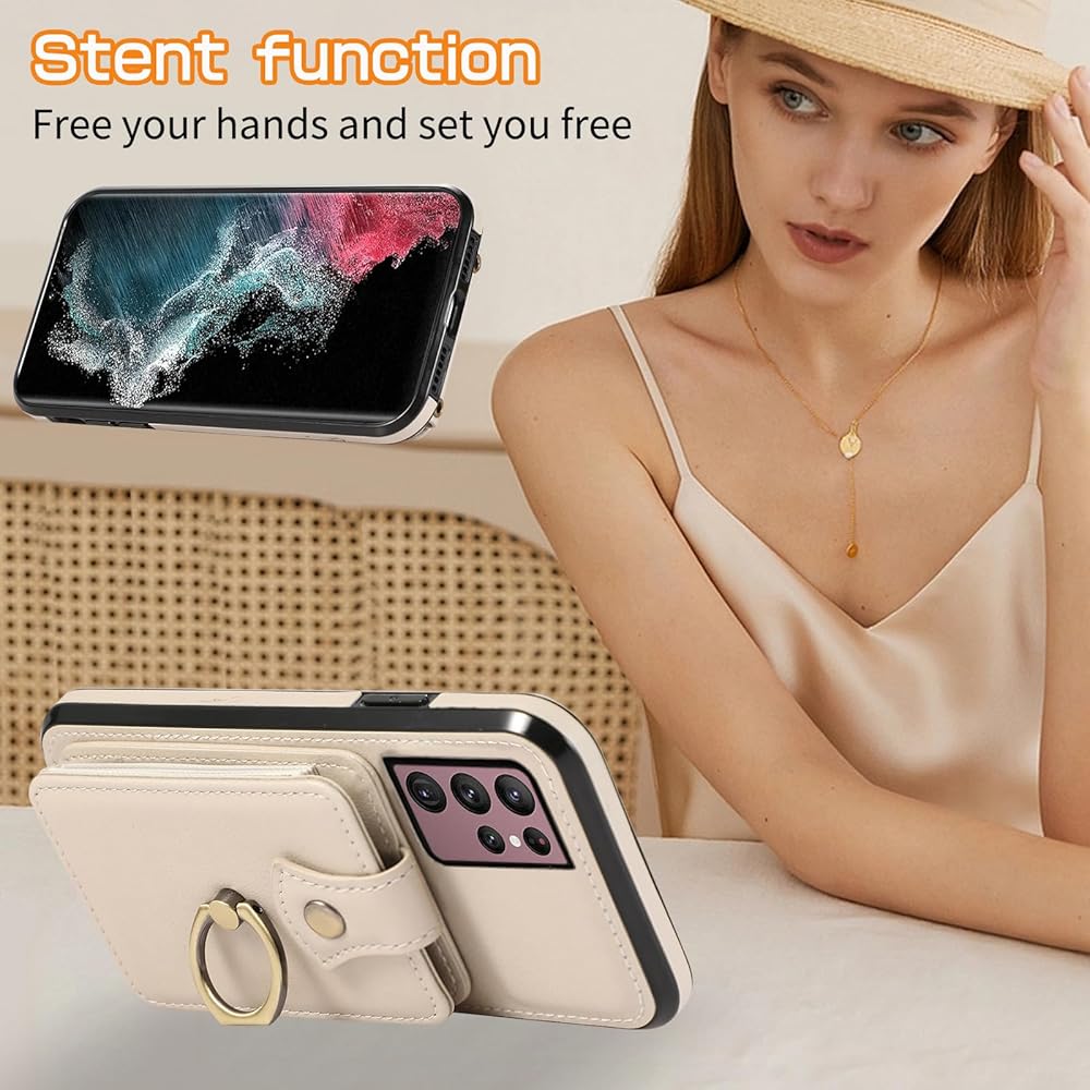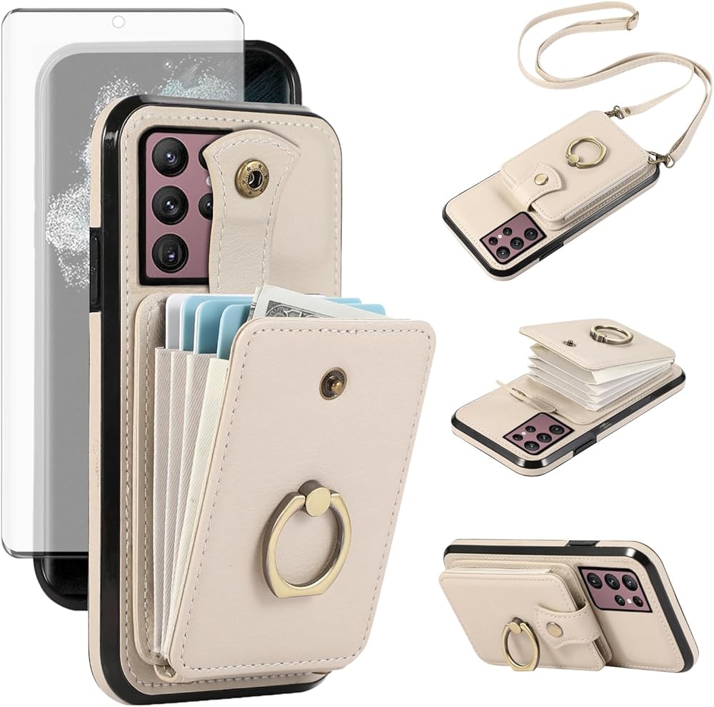 Asuwish Phone Case for Samsung Galaxy S22 Ultra 5G Wallet Cell Cover with Screen Protector Crossbody Strap Ring Stand RFID Credit Card Holder S22ultra 22S S 22 S22ultra5g 6.8 Women Girls Beige