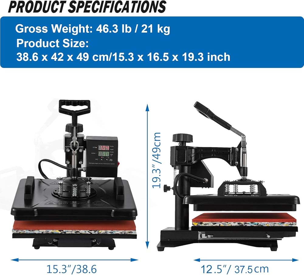 👚 360° Rotation and Guide Rail Design -- With a fully rotated 360 degree swing-away and bottom guide rail design, allows the heating element to be moved safely aside, reducing the chance of accidental contact, also make it easy to replace the plate press and hat press. The bottom strong base and top pressure knob make it more stable when using, this heat press machine provides a full range press directly and evenly, guarantees the quality of finished transfers.