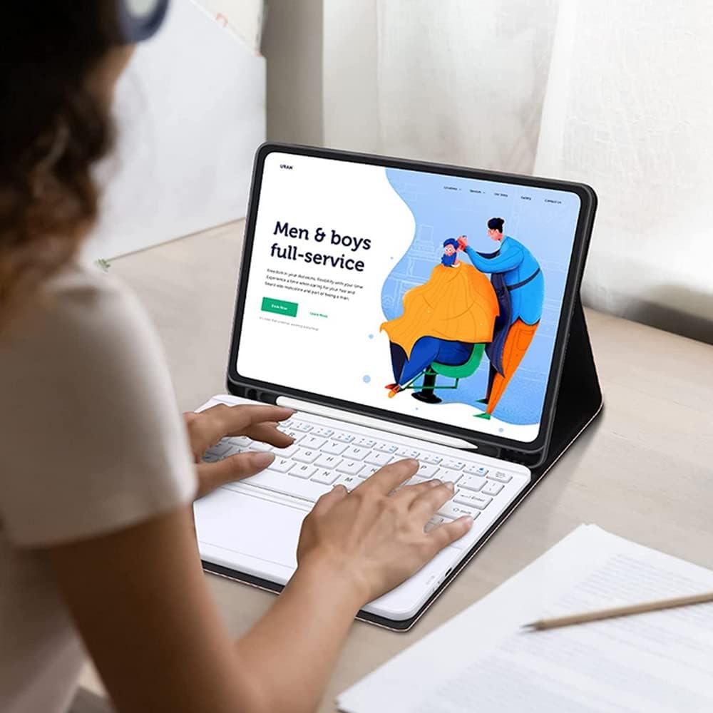 [Detachable magnetic keyboard]: The magnetic keyboard and case are separated, magnetically attached, the keyboard can be removed from the case. Well-spaced sky blue keys and spring mechanism underneath offer better tactile response for users, English designed keyboard providing a fast and smooth typing experience. The detachable bluetooth keyboard also allows you to connect with other iOS, Android, and Windows devices of your choosing.