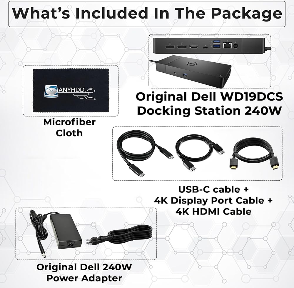 [Package Includes] - WD19DCS Dock 240W, 1x USB Type-C Cable, 1x HDMI Cable, 1x Displayport Cable, Original 240W Power Adapter, Microfiber Cloth