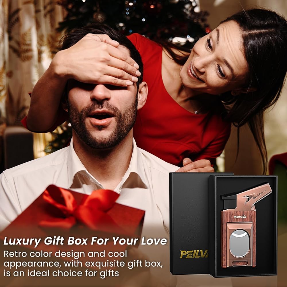 【Masterfully Engineered Torch Lighter】 This butane torch lighter integrates a windproof jet flame, sharp cutter, and punch tool in one sleek. The lighter compact design (Size: 4.05*1.68*0.73 in, weight: 0.37 lb). Equip with flame regulator and cooling holes to increase selectivity and safety. A transparent fuel window allows easy check of butane levels. Ideal for travel, outdoor adventures, or everyday carry, this lighter merges performance and elegance in a cool (Note: Butane gas not included)