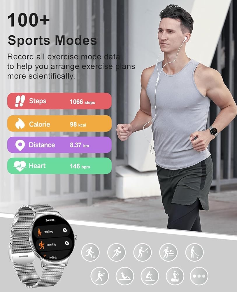 【100+ Sports Modes & IP67 Waterproof】Elevate your fitness with this versatile smartwatch featuring 100+ sports modes, including walking, running, dancing, gym workouts, outdoor adventures, and more. Track key metrics like steps, calories, and heart rate for a complete overview of your performance. Built with IP67 waterproof protection, it withstands rain and sweat, letting you exercise worry-free in any environment. Note: Not suitable for swimming, diving, or prolonged sauna use.