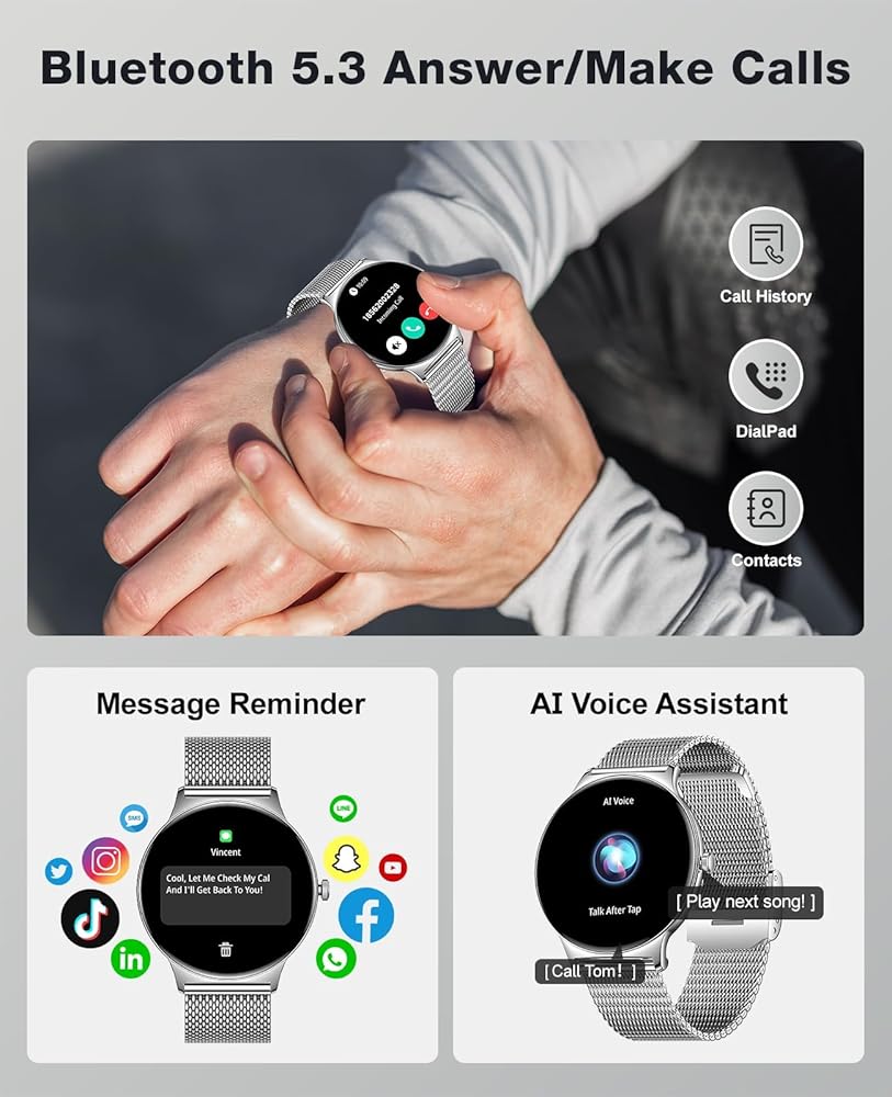 【Bluetooth Calls & Smart Notifications】Stay connected effortlessly with this advanced smartwatch! Featuring Bluetooth 5.3 and a high-quality mic and speaker, it ensures crystal-clear calls directly from your wrist. Get instant notifications of SMS and APP messages with gentle vibration, and read messages directly on the watch (editing and sending not supported). The built-in AI voice assistant simplifies tasks, while wide compatibility with Android 4.0+/iOS 9.0+ makes it perfect for everyone.
