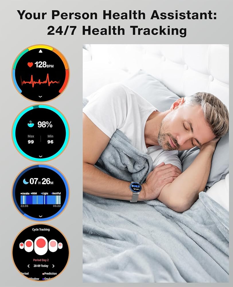 【Comprehensive Health Monitoring】Take control of your well-being with this smartwatch, featuring advanced optical sensors for precise heart rate, blood oxygen (SpO2), and stress monitoring. It also tracks your sleep stages (light, deep, REM) to improve your rest and health. Plus, enjoy features like sedentary reminders, hydration reminders, and menstrual cycle tracking, helping you make smarter, healthier choices every day. Elevate your lifestyle and stay on top of your health with ease!