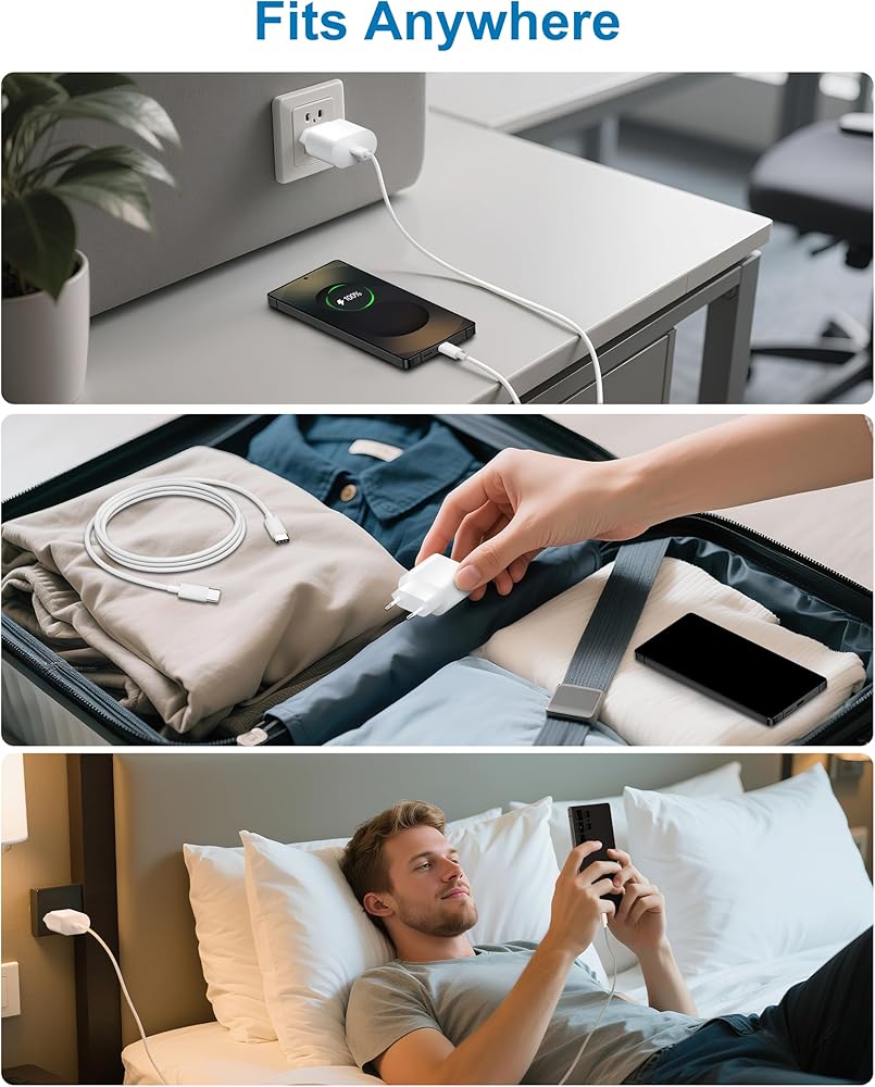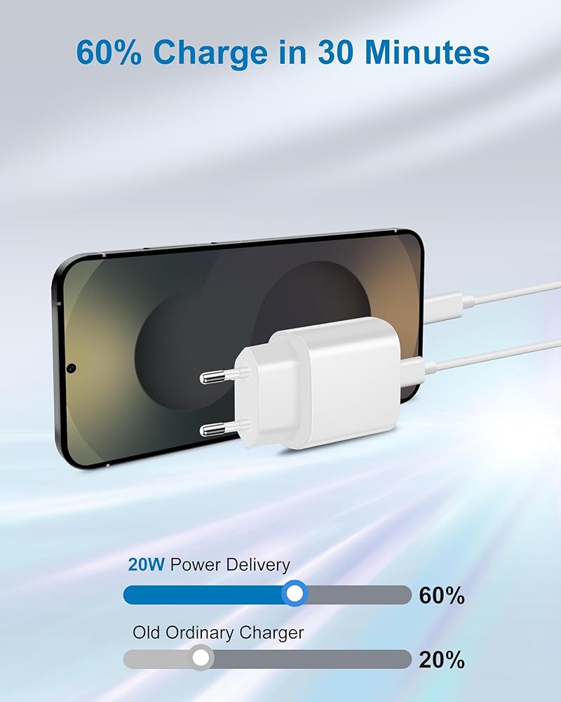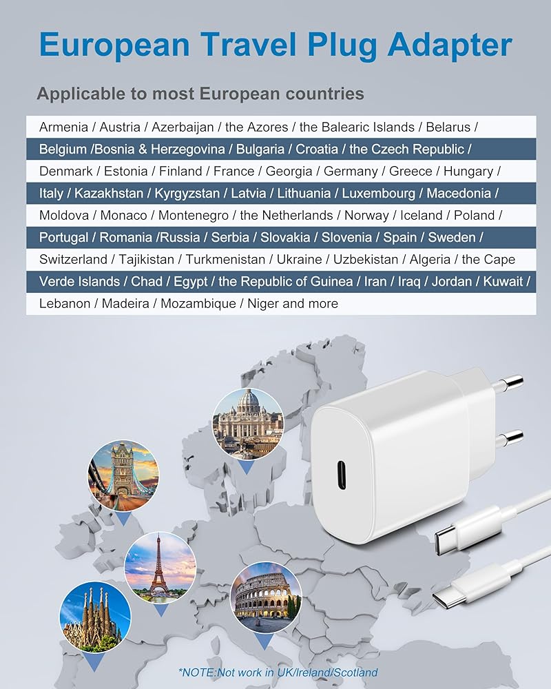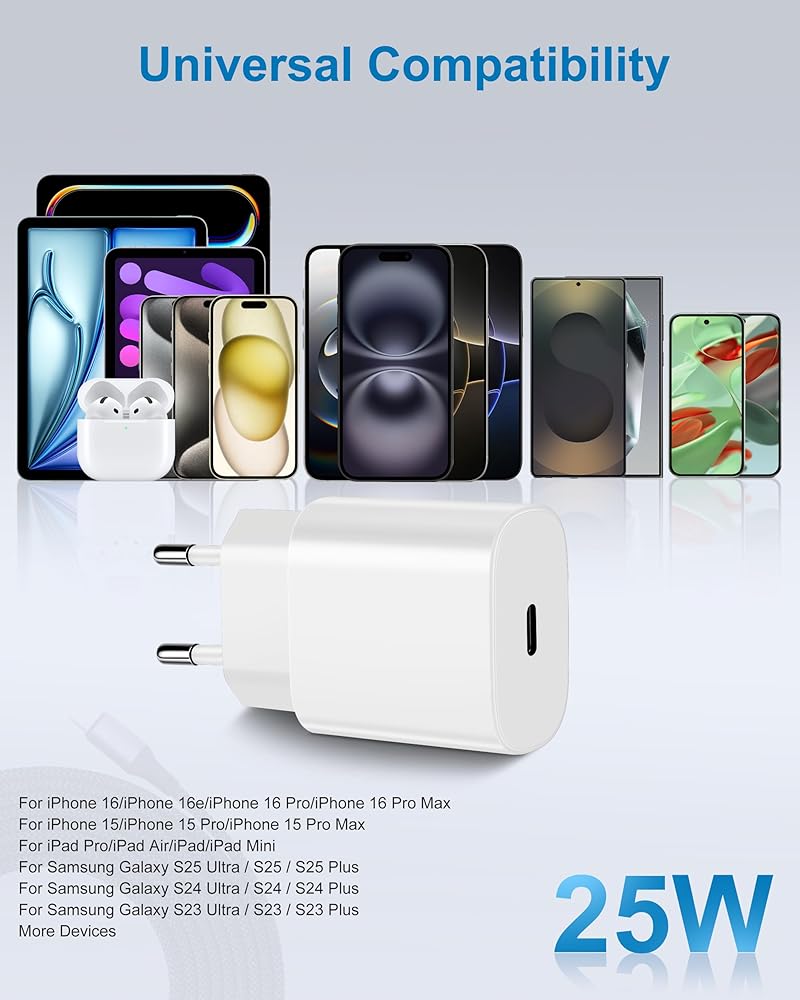 Universal Compatibility: European USB C fast charger compatible with iPhone 16/16 Plus/16e/16 Pro/16 Pro Max, 15/15 Plus/15 Pro/15 Pro Max, iPad Air/Pro/Mini, AirPods, Watch 8/7 series, Samsung Galaxy S25/S24/S23/S22/S21/S20/S10/S9/S8 Plus, Z Fold/Z Flip, A55/A54/A53/A52/A15/A13/A72/A71, Note 20/10, Google Pixel, Moto, LG, Tablets, Android Phones and more