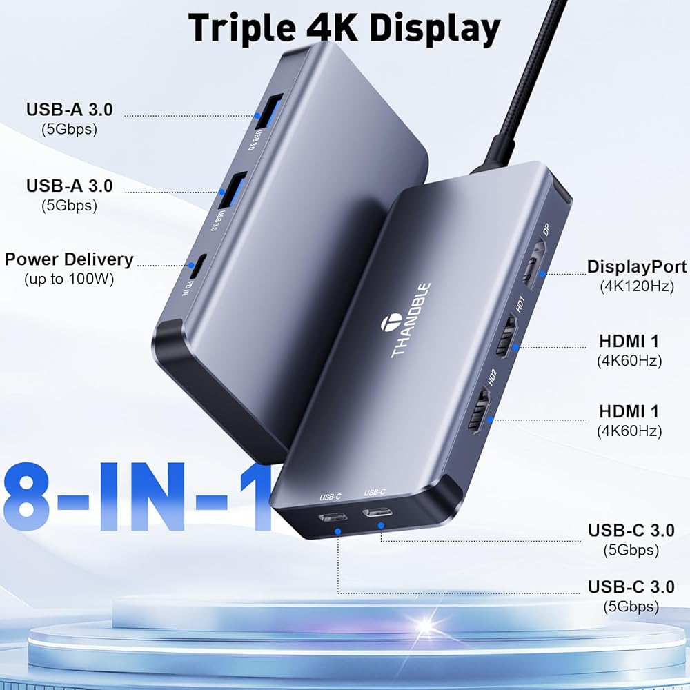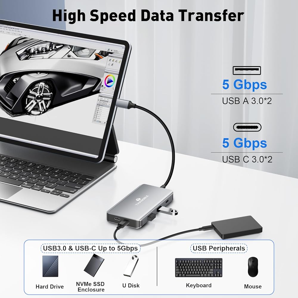 【Plug and Play All-in-One Expansion】 THANDBLE 10-in-1 USB-C Hub requires no driver installation, plug and play, easy to expand your device interface. Equipped with 2 x 4K60Hz HDMI, 3 x USB 3.0, 2 x USB-C, 100W PD fast charging ports and SD/TF dual card slots, it meets the needs of multi-screen office, data transmission, device charging and memory card reading in all scenarios, so say goodbye to the worry of insufficient interfaces
