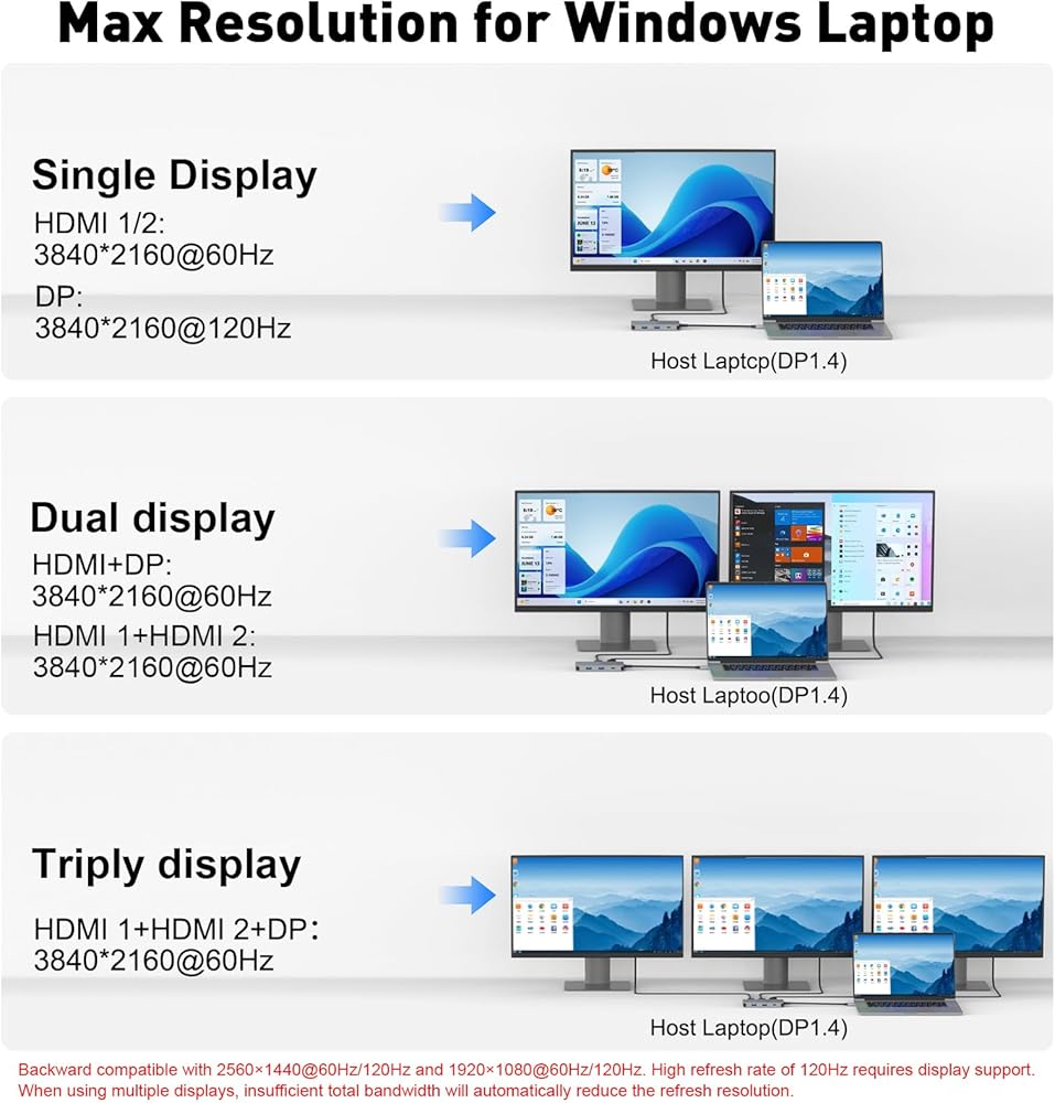【Compatible with All Platforms and Mainstream Devices】 USB C Docking Station perfectly adapts to USB4/Thunderbolt 3/4/5 ports, M1/M2/M3 chip devices, including MacBook all series, iPad Pro, Surface, Dell XPS, Lenovo ThinkPad and other mainstream notebooks (Note: Mobile phones need to support USB 3.1 protocol). Adopting high quality chipset, signal stability without degradation.Mac OS compatible with 4K60Hz,2K60Hz,1080P 60Hz.Windows backward compatible with 2K120Hz,1080P 120Hz