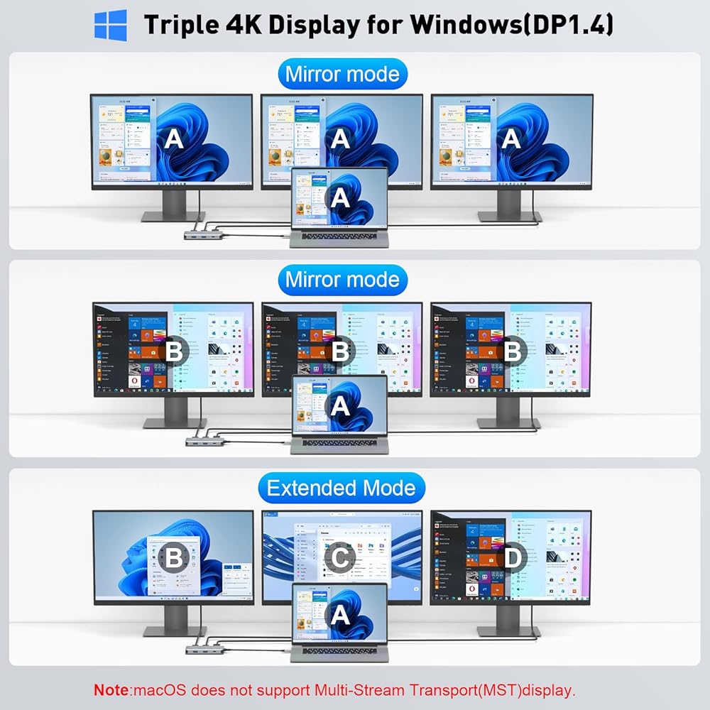 【Dual 4K HD Projection Multitasking Efficiency King】 Dual HDMI ports support mirroring/expansion mode, which can simultaneously output dual-screen 4K@60Hz ultra-high-definition images, perfectly adapted to design editing, video conferencing, or home theater scenarios.Windows system supports expansion mode (MST) to achieve cross-screen multitasking, while Mac/Linux/Android users can enjoy mirroring mode (SST) to seamlessly switch between work and entertainment