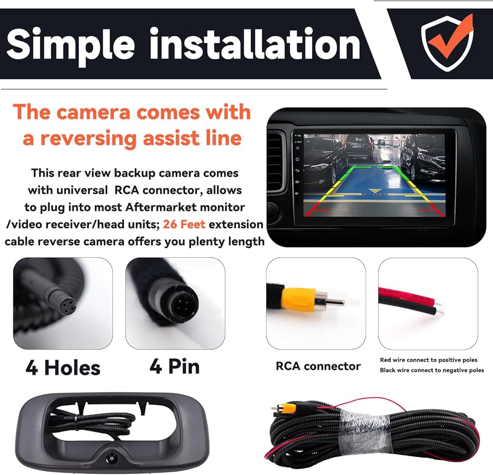 【Easy Installation】:Easy to install, plug and play. Simply connect the power supply of the camera to the reversing light, and then connect the tailgate handle camera to your radio screen or monitor using the 8M RCA cable we provide.