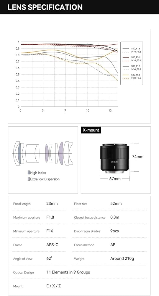 Excellent optical performance: with 7 groups and 8 lenses structure, equipped with 7 aperture blades, the closest focusing distance is 0.25 meters, which can provide good imaging quality.