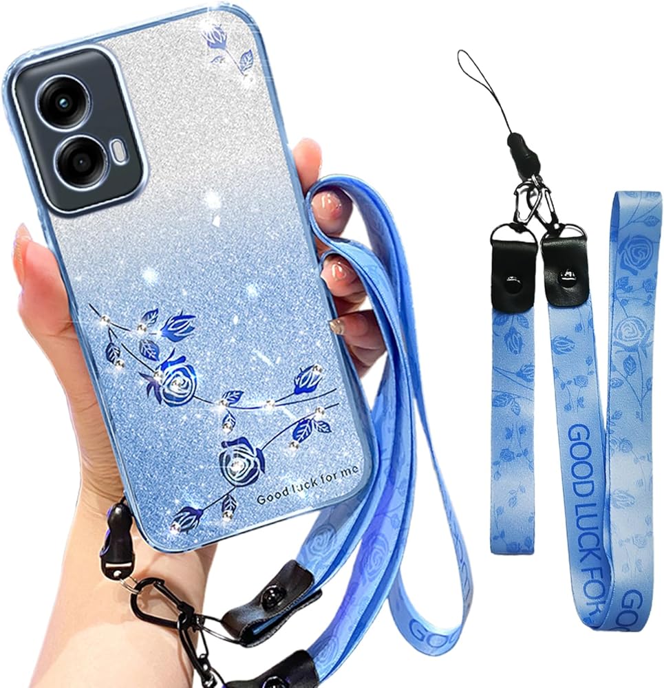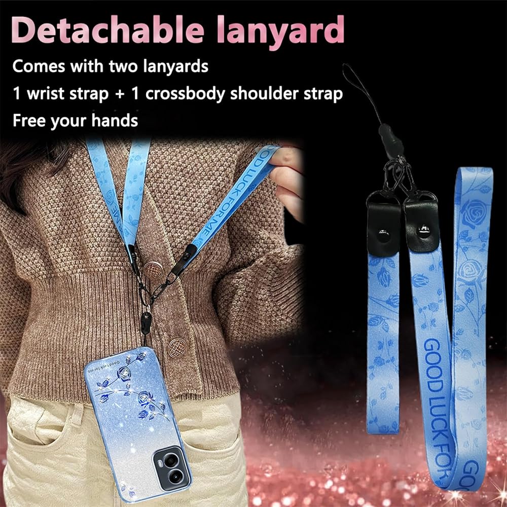 for Motorola G Stylus 5G 2024 Case with Crossbody Lanyard and Wrist Strap, Glitter Clear Floral TPU Protective Cover for Women Girls Bling Diamond Design for Moto G Stylus 5G 2024 – YSS Blue