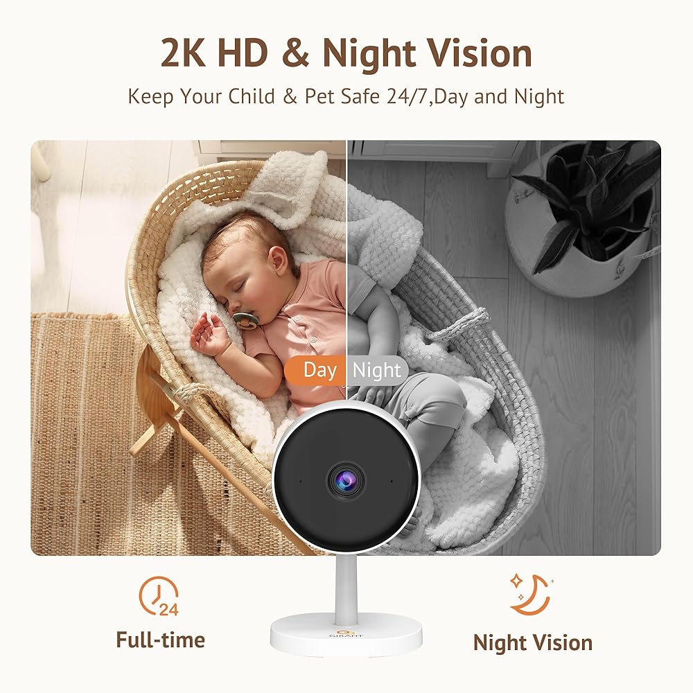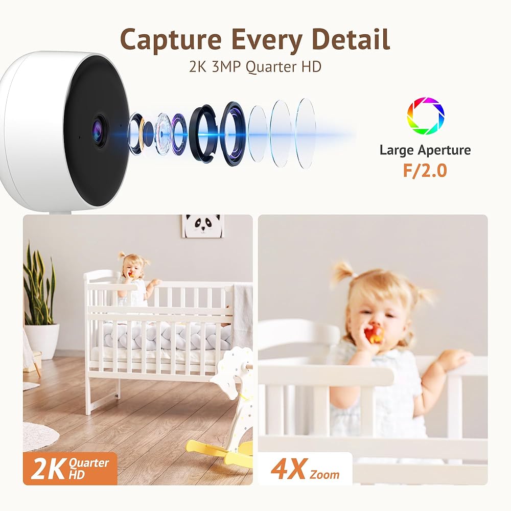 【Indoor Camera】Ultra 2K Res & IR Night Vision: Enjoy 3MP HD clarity with 4x digital zoom. See every detail, even in total darkness up to 33ft with advanced IR night vision. Perfect for day and night surveillance.