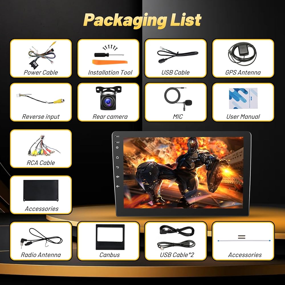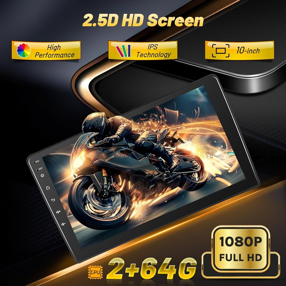 10 Inch Ultra HD Touch Screen and Split Screen Function : The 10 inch IPS display lets you enjoy realistic colors from any angle, the 2.5D capacitive touch screen lets you control it with your hands smoothly, and the 1024*600 high resolution lets you enjoy clear and vivid pictures or videos. With the split screen function, you can enjoy two views on the same screen at the same time, for example, you can display GPS and music at the same time, bringing you a pleasant driving experience.