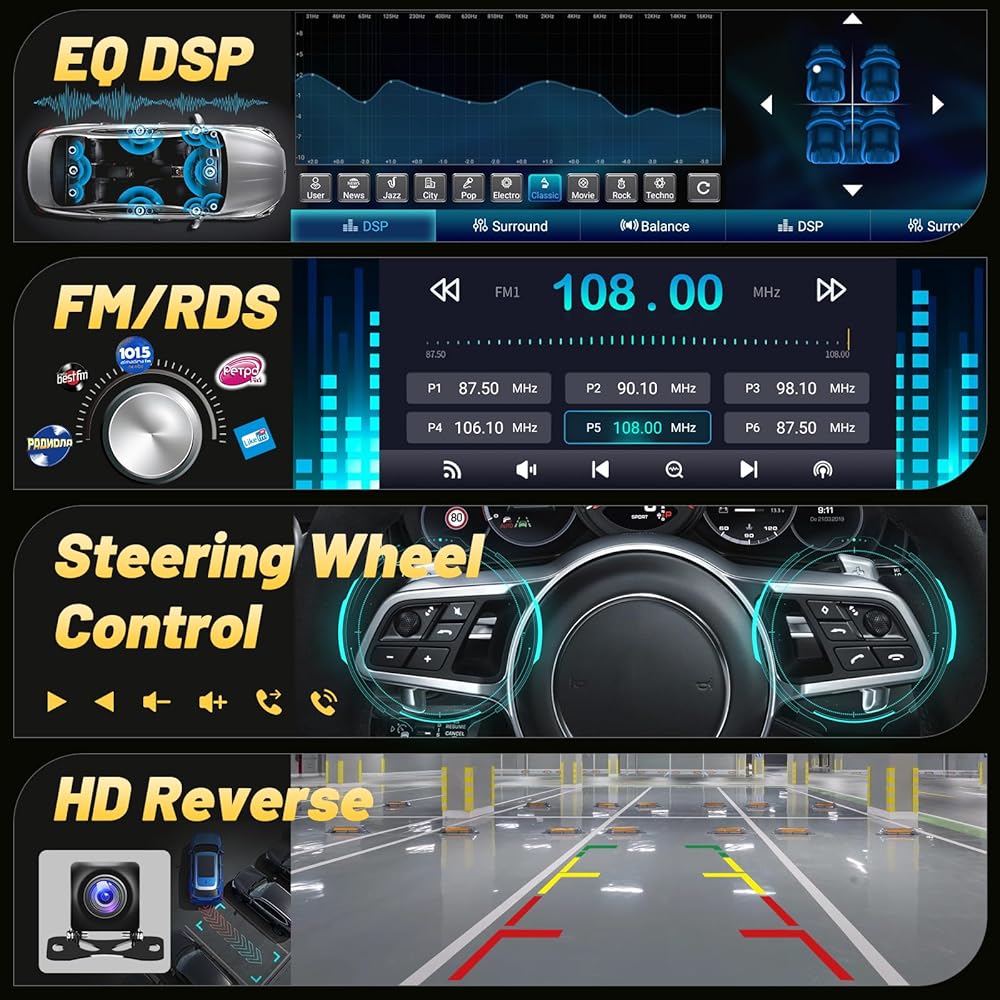 Wireless and Wired Carplay & Android Auto: This car player radio is compatible with iOS CarPlay and Android Auto, which allows you to use your phone seamlessly on the big screen, you can talk hands-free with the help of Siri or other voice assistants, and get easy access to your cell phone contacts, emails, notifications, maps and navigation, music, videos and more, which means you can focus more on road safety while driving!