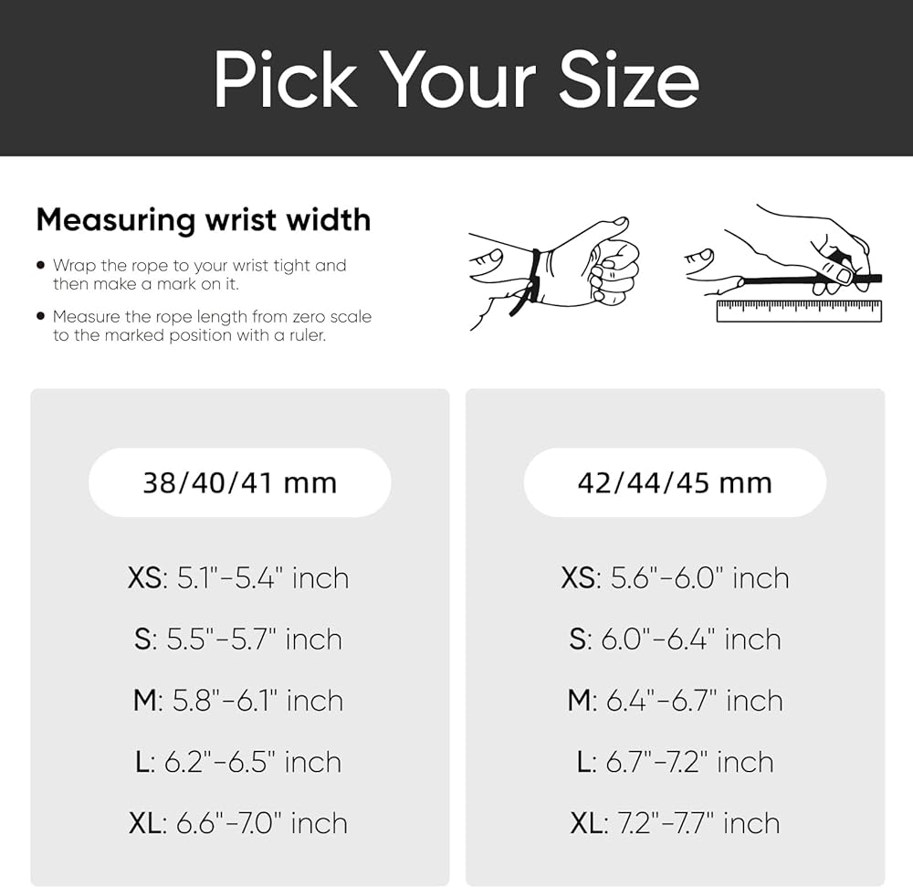 Size Options: 38mm/40mm/41mm XS for 5.0"-5.3" (127mm-135mm) wrist, S for 5.35"-5.6" (136mm-142mm) wrist, M for 5.6"-6.0" (143mm-153mm) wrist, L for 6.05"-6.4" (154mm-163mm) wrist, XL for 6.45"-7.0" (164mm-177mm)wrist; 42mm/44mm/45mm/49mm XS for 5.4"-5.8" (137mm-147mm) wrist, S for 5.83" -6.2" (148mm-157mm) wrist, M for 6.22"-6.57" (158mm-167mm) wrist, L for 6.6"-7.1" (168mm-180mm) wrist, XL for 7.12"-7.7" (181mm-195mm) wrist