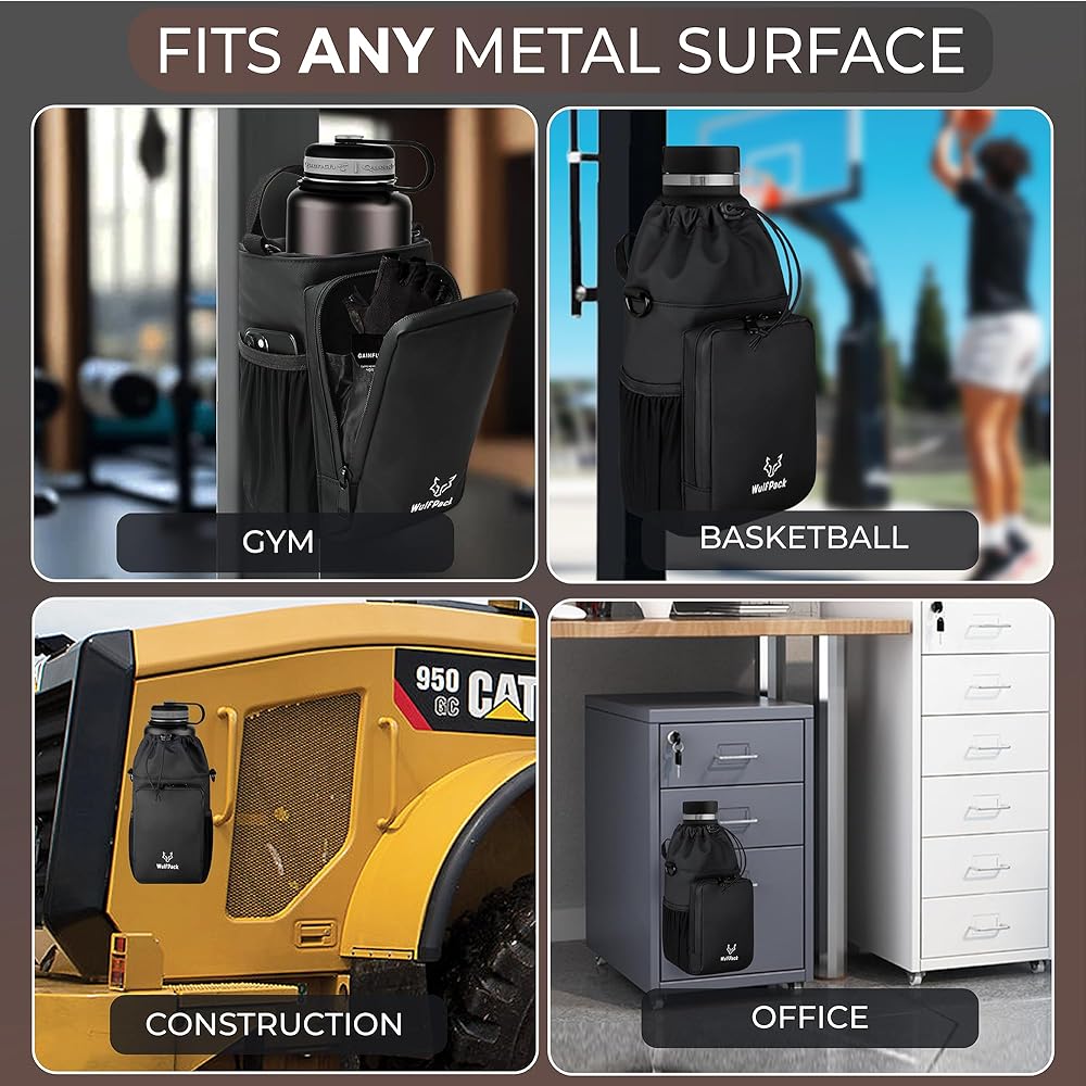 WulfPack Magnetic Gym Bag, Magnetic Bottle Bag, Water Bottle Carrier Holder with Large Phone Pockets, Large Pockets, Gym Bag, Work, and Sports (Black)