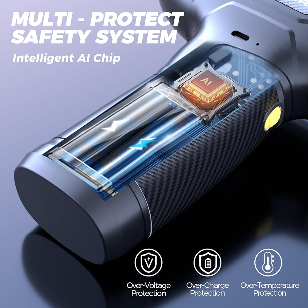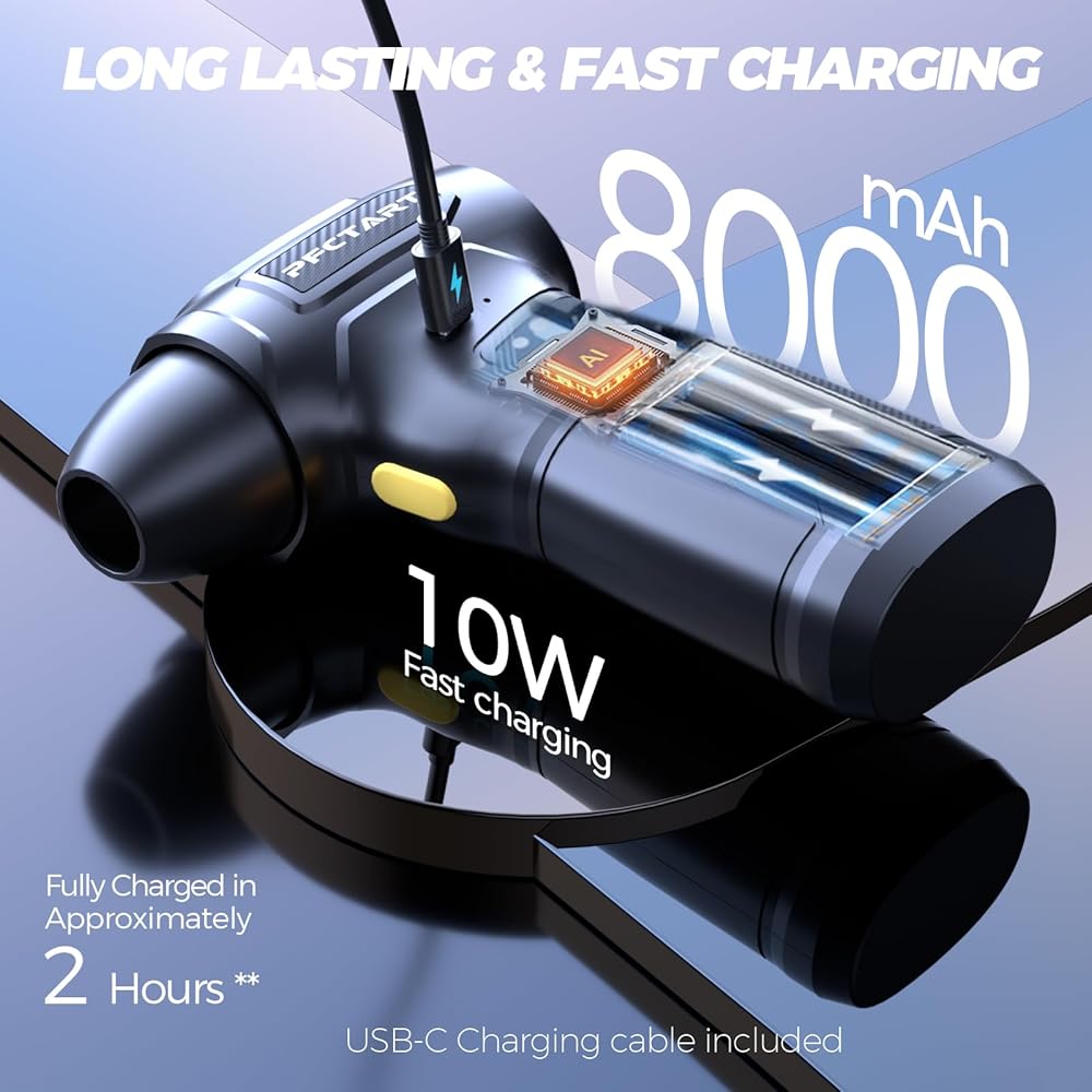 Fast Charging & Long Battery Life: Powered by an 8000mAh lithium battery, the air blower charges fully in just 2 hours with 10W fast charging. It includes over-temperature, current, and short-circuit protection for safe and reliable performance
