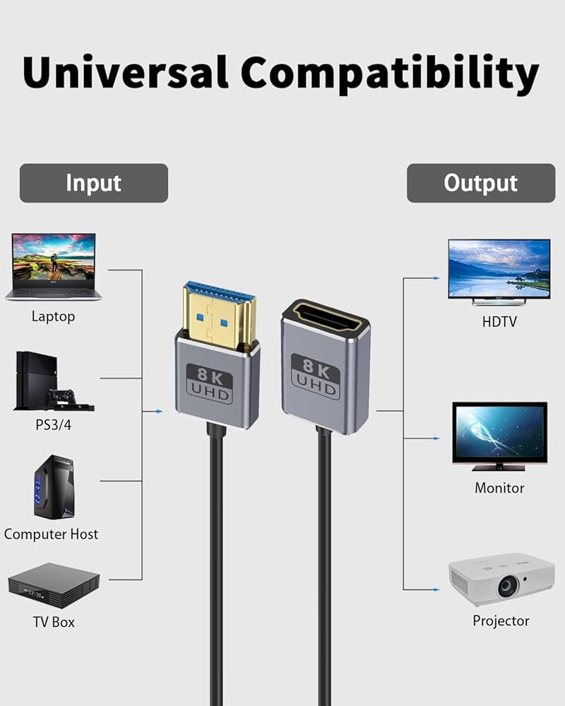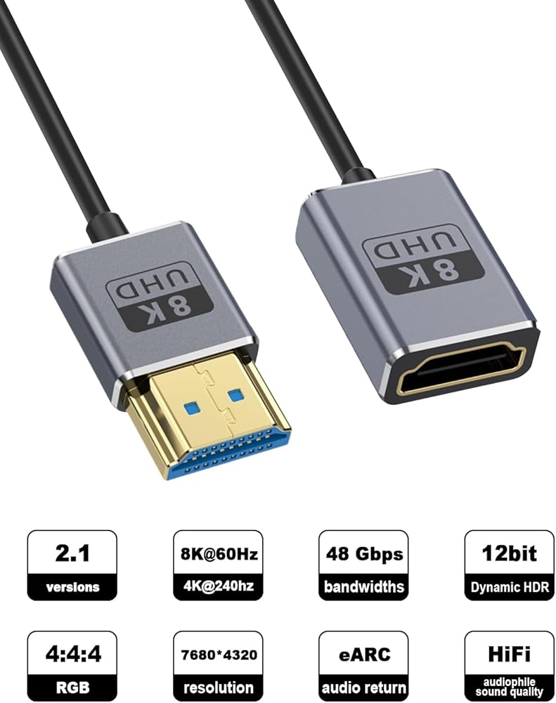 This 8K HDMI male to female cable supports the HDMI 2.1 standard and features high resolution and high refresh rate. It can easily achieve high-definition video transmission such as 48K@60Hz and 4K@240Hz, while perfectly accommodating multi-channel audio signal transmission. It brings you a clear, smooth and realistic audio and video feast, providing an unparalleled immersive experience.