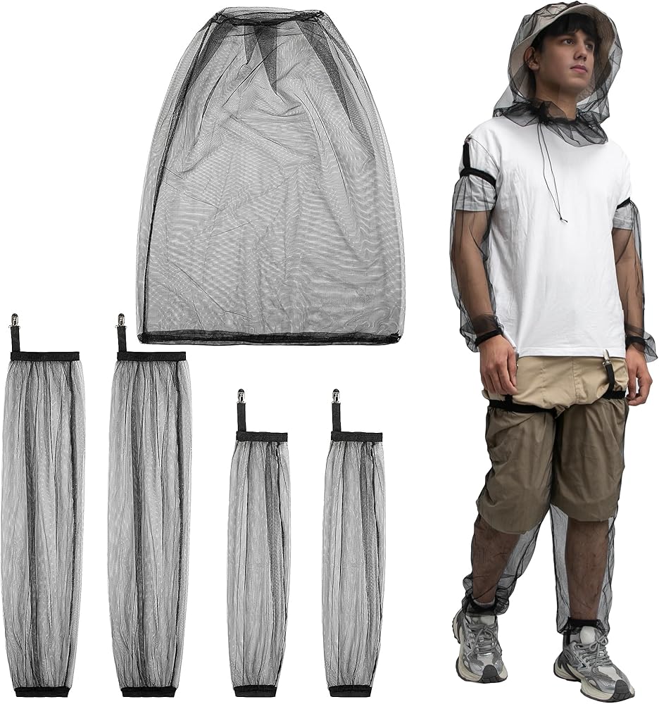 Mosquito suit:You'll receive 5 pieces of mosquito kit that includes 2 cuffs, 2 leggings, and 1 elongated mosquito net cap. Provides full coverage protection for your entire body from mosquitoes and other bugs.