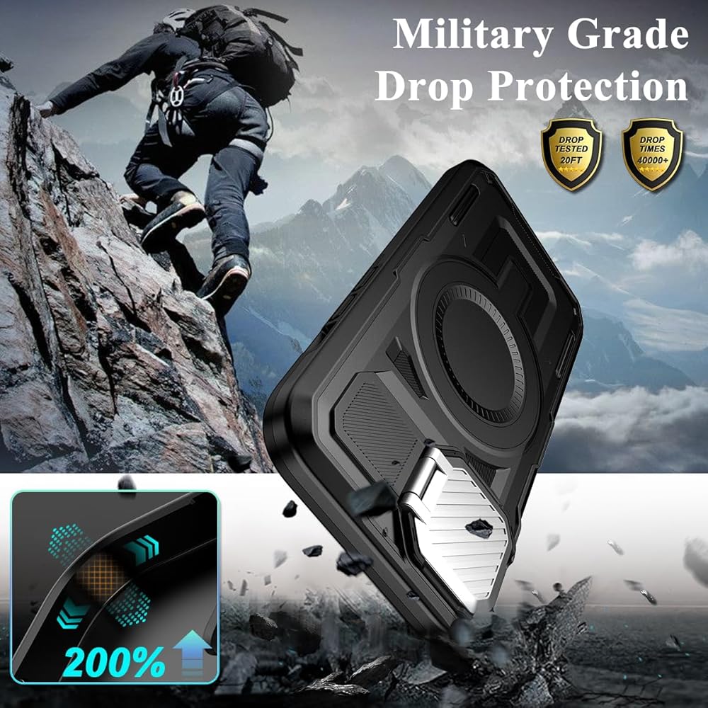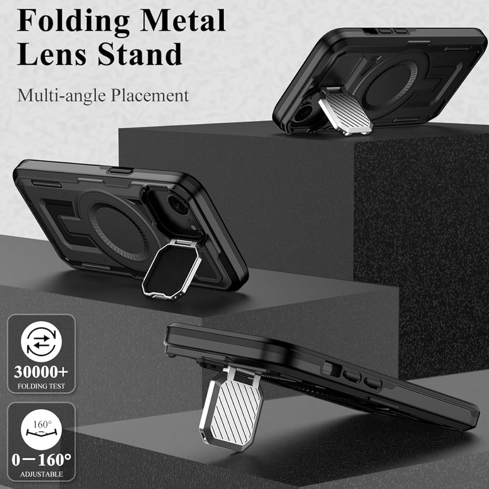 Adjustable Lens Protection Stand: Built-in metal alloy lens guard with adjustable angles (0°-180°), protecting the camera while doubling as a hands-free stand for videos and calls.When the camera cover reaches the fully closed position,you'll hear a "click" and the cover stays firmly in place.