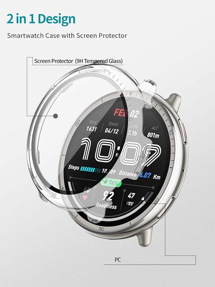【2 In 1 Design】Integrated with hard PC shell and 9H hardness tempered glass screen protector.All Around protects your Smartwatch from scratch, bumps and accidental drops.