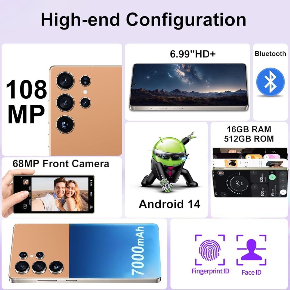 【6.99 HD+ Android 14】This is an Android Cell phone with a large screen,6.99”HD+ Display 1440*3040,This unlocked Android 14 I25 Ultra phone is equipped with a 108MP main camera and a 68MP front facing camera, better recording a beautiful life and showcasing your beauty. And it has facial recognition and screen fingerprint unlocking functions, which effectively protect your privacy.