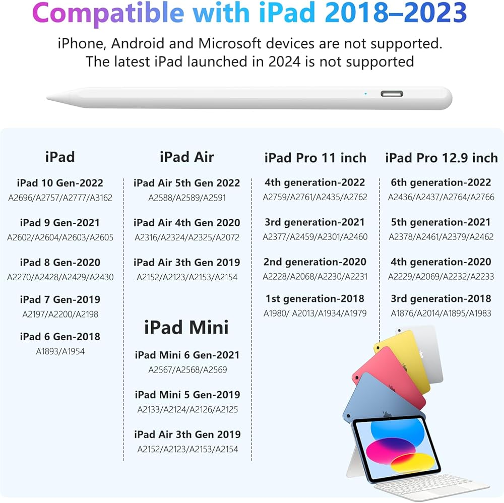 For iPad 2018-2023: This ipad pen is compatible with Apple iPad 2018-2023. This stylus pen for iPad 10th/9th/8th/7th/6th Generation, for iPad Air 3rd/4th/5th Gen, for iPad mini 5th/6th Gen, for iPad Pro 2018-2022(12.9"/11"). Note: Not compatible with iPad Pro 12.9" 1/2 Gen and any Other Models, iPhone, Android or Microsoft devices
