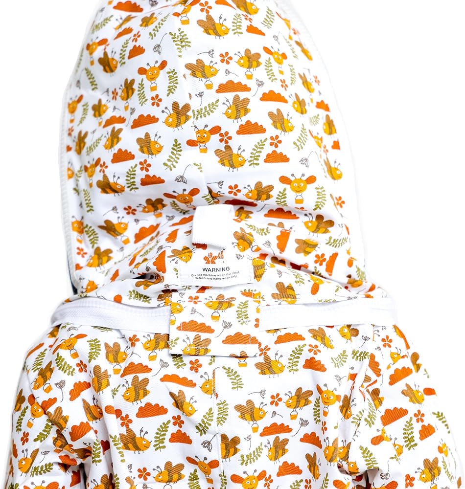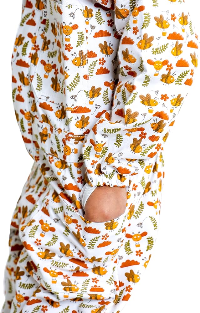 Kids Beekeeper Costume Design with Collapsible Veil to back allow kids to drink eat test honey from hive while wearing the suit. These childrens bee suits elastic closure at arm and legs for protection.