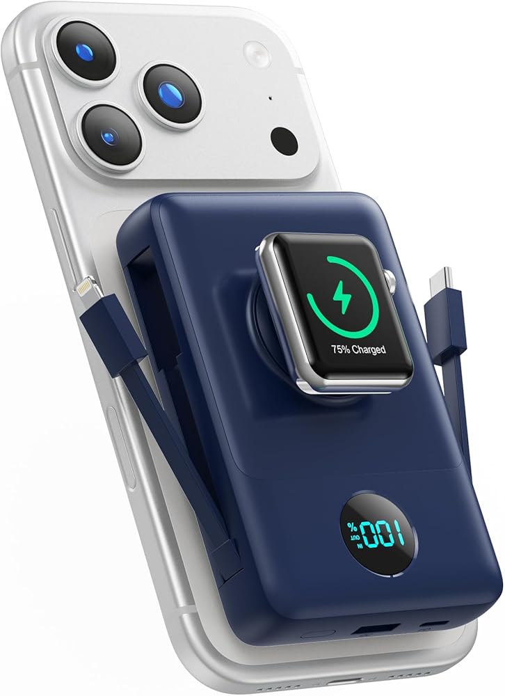 -- 6 Output Ports include dual magnetic wireless charging for iPhone 12-16 series/Airpods/Apple Watch, built-in 2 cables for both iOS and Type-C devices, and additional 2 USB ports (USB-A+USB-C) for maximum flexibility.