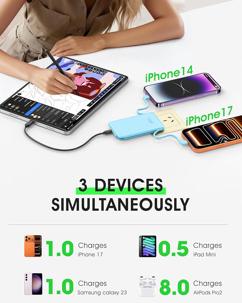 • Simultaneous Charging: With 3 outputs,2 built-in cables and a USB C in/out port, the charging bank can power your devices at the same time, greatly improving charging efficiency. Besides, multiple interface types are widely compatible with iPhone 16 15 14 13 12, etc, and most Android phones