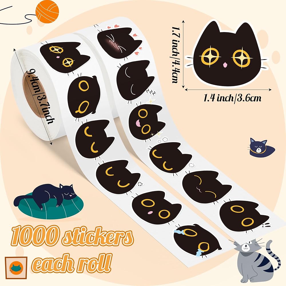 Unique & Affordable Value: Our set includes 2 rolls of cartoon black cat head stickers (1000pcs total), offering a unique and affordable way to decorate parties and daily items. These versatile stickers add a personal touch to various surfaces, making them perfect for creative expression.