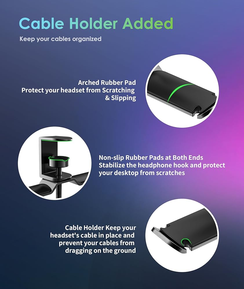 Anti Scratch Design: Friendly to Your Desk, rubber pads are attached on both clip's ends, protecting your desk surface from scratches. The headset hanger is able to mount all desk, thickness within 5mm to 53mm . Also suitable for cabinets, shelfs, even glass flat surfaces