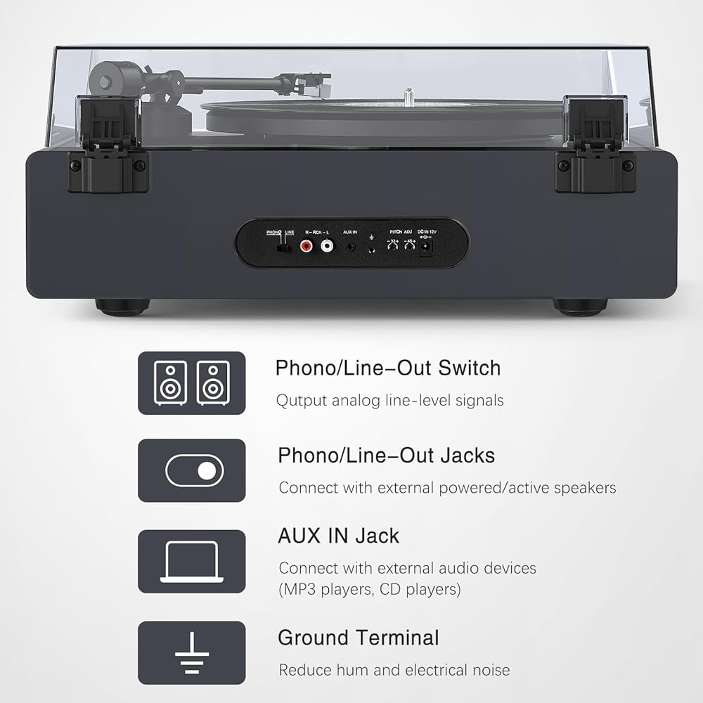RCA Line Out: The RCA line output allows you to easily connect the turntable to external speakers or audio systems, giving you more flexibility to customize your listening experience