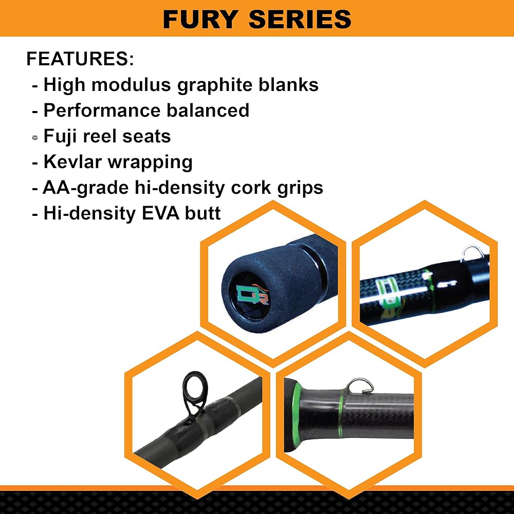 The Fury Series is sensitive, light, strong and balanced at an exceptional value! The Dobyns Rods Fury Series boasts those essential features that anglers demand: high modulus graphite blank, Fuji reel seat, Kevlar wrapping and AA-grade cork grip with hi-density EVA butt. A total of 17 technique-specific rods, including popular crankbait, flipping, swimbait, spinning and casting models, round-out the series. Whether you are looking for a budget-friendly option, or to simply add an extra rod to your arsenal, give Dobyns' Fury Series a try!